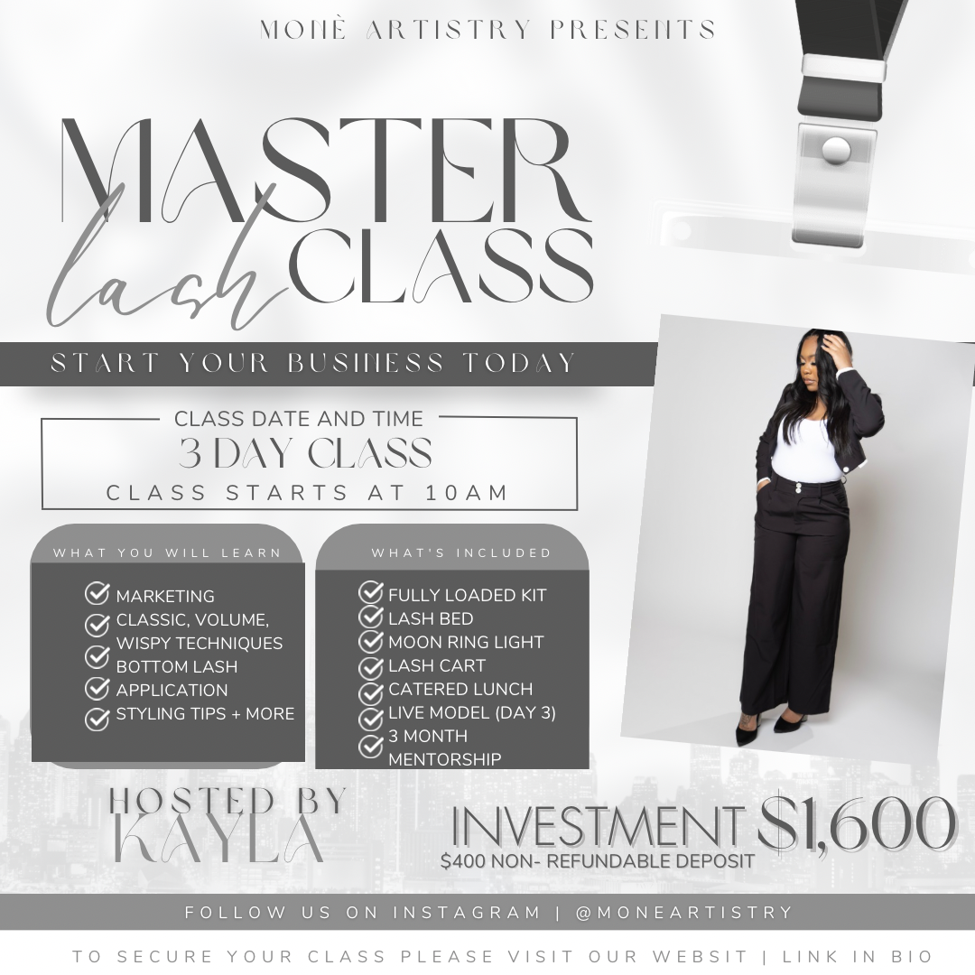 We will cover lash application, sanitation, creating handmade fans, fundamentals and much more. You will also receive a full lash kit branded with Monè Artistry products that will last up to 1 year , training manual and a certificate of completion